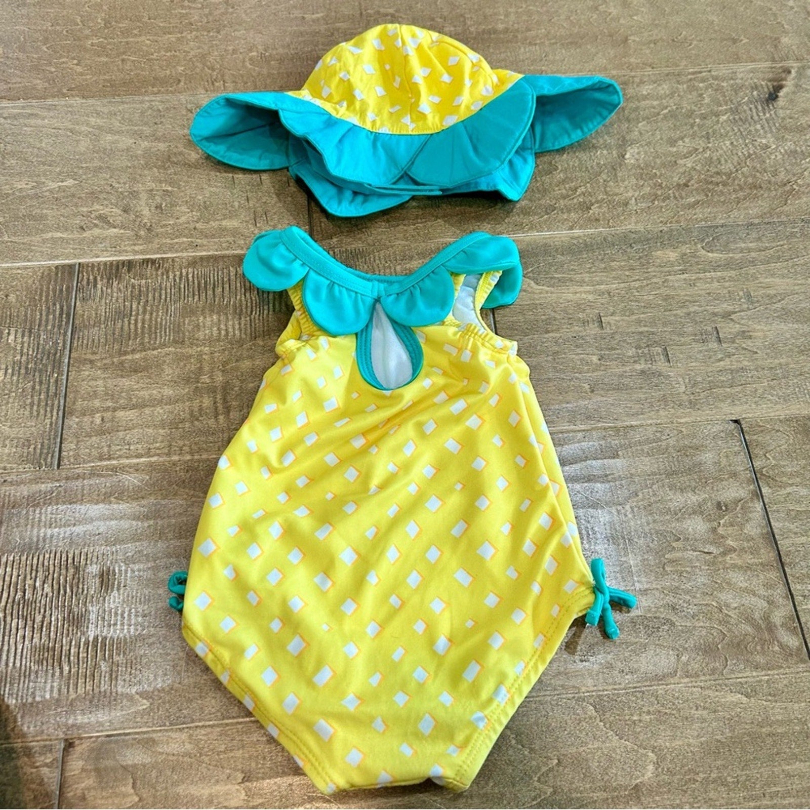 Gymboree Toddler Girls Print Ruffle One Piece Swimsuit w/ Hat Yellow 12-18 M EUC