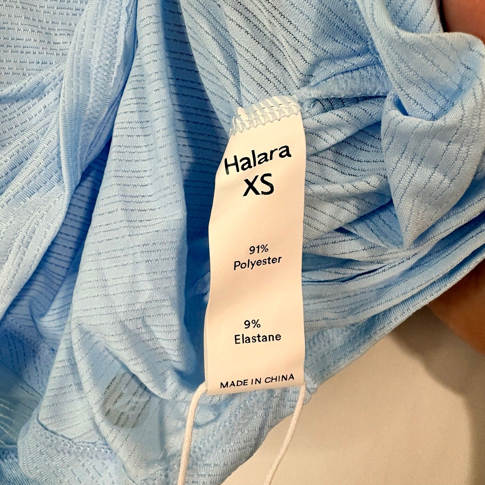 Halara tank top, women’s athletic tank, light blue workout top, crisscross back tank, size XS activewear, Halara sleeveless top, polyester elastane tank, NWT Halara top, gym tank top, everyday athleisure shirt