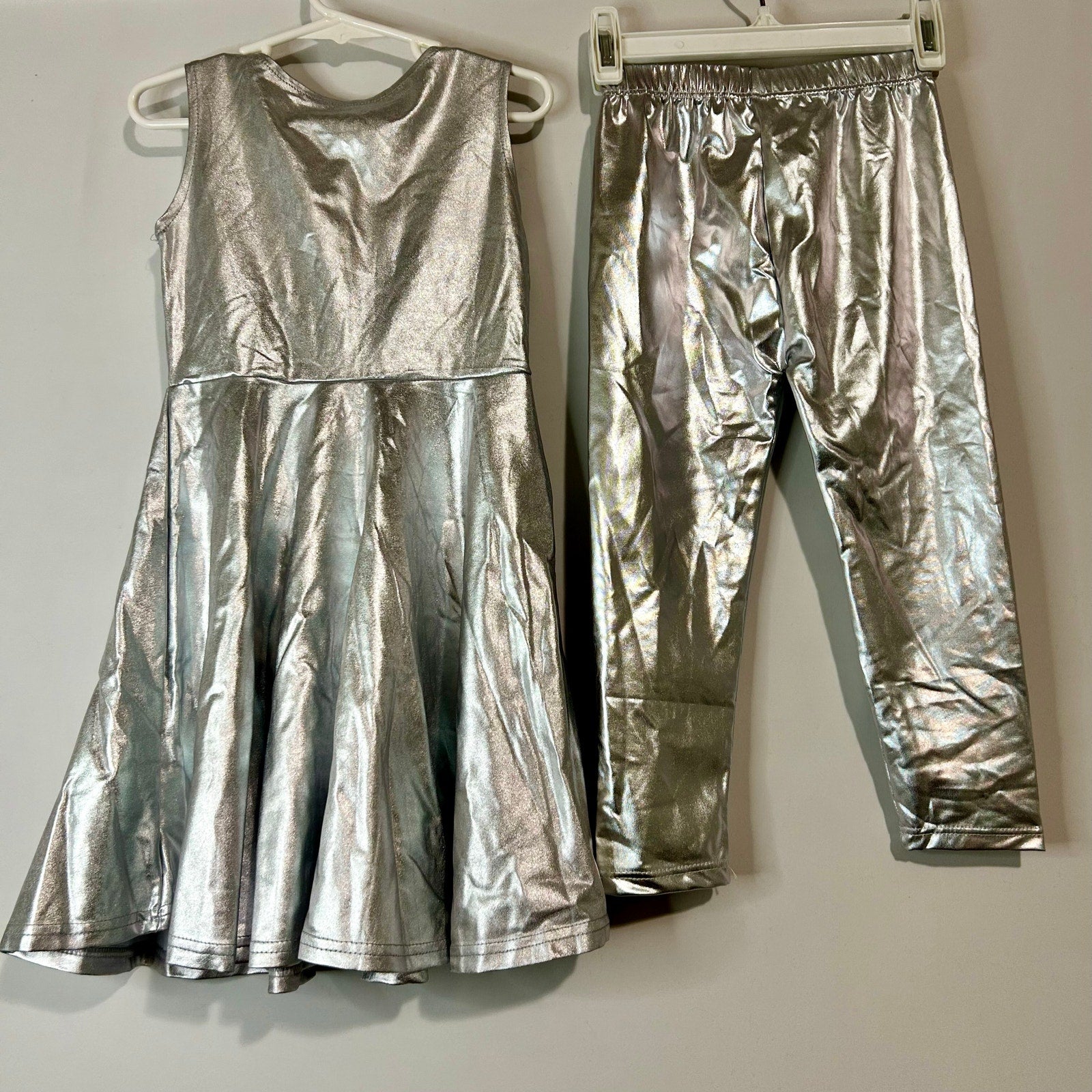 kids Tin Girl costume, Wizard of Oz costume, Luckygal costume, Aaronano leggings, light-up heart costume, silver kids outfit, girls size small, Halloween Tin Girl, metallic dance costume, Wizard of Oz dress-up, shiny kids costume, silver leggings set, light-up heart outfit, fantasy costume
