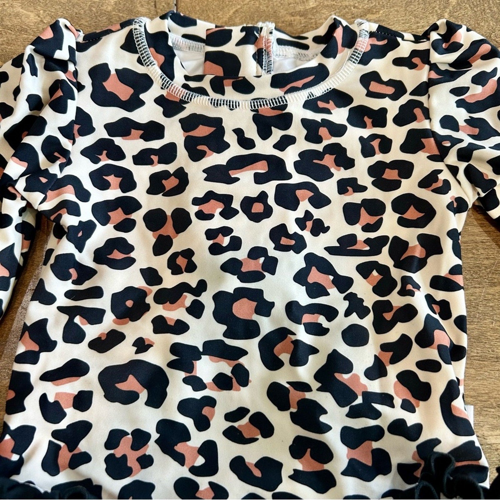 Cream with black and tan leopard print and black ruffle detail